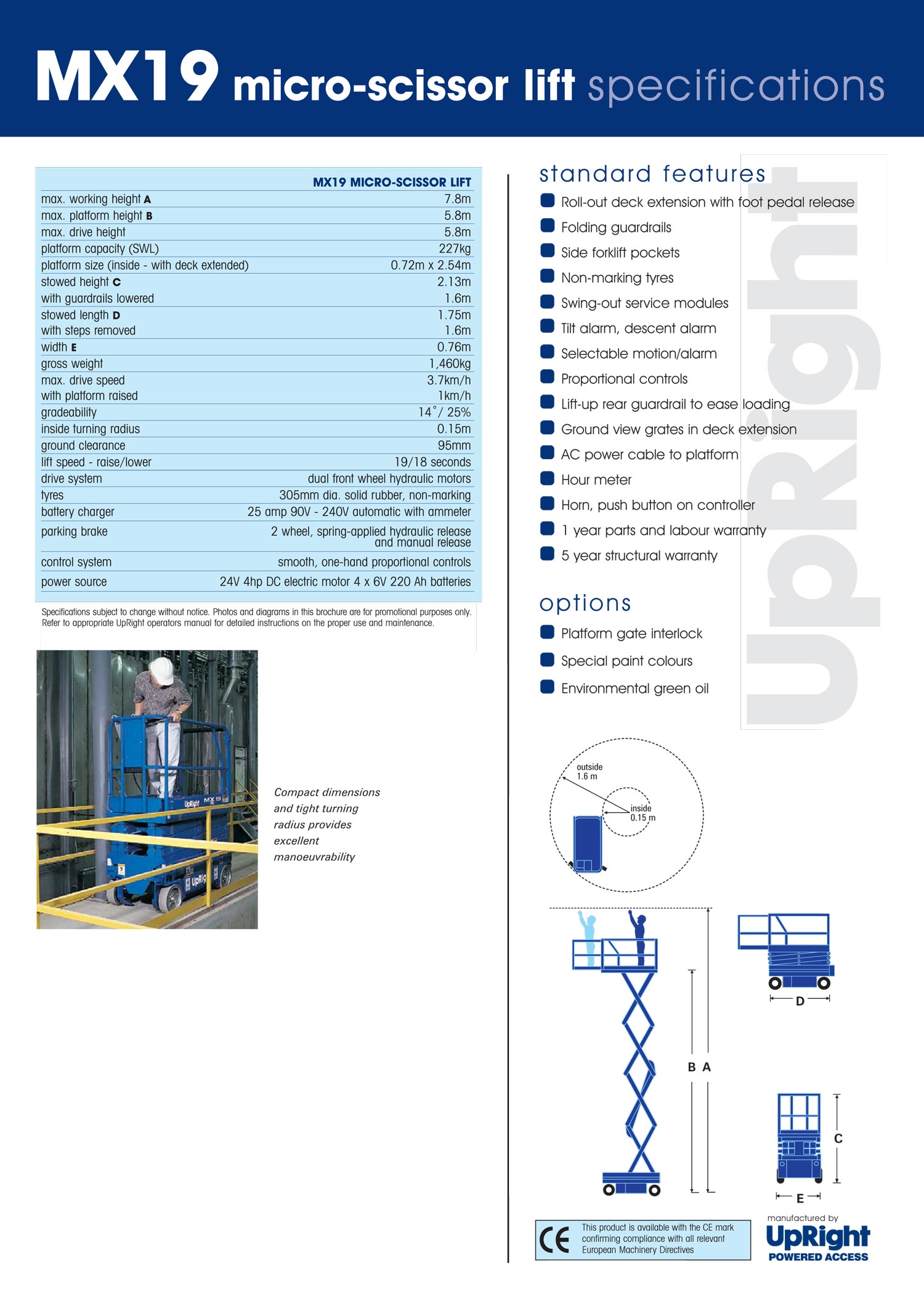 he extremely compact Upright MX19 Electric Scissor Lift has a width of 30 inches, providing excellent mobility and versatility.